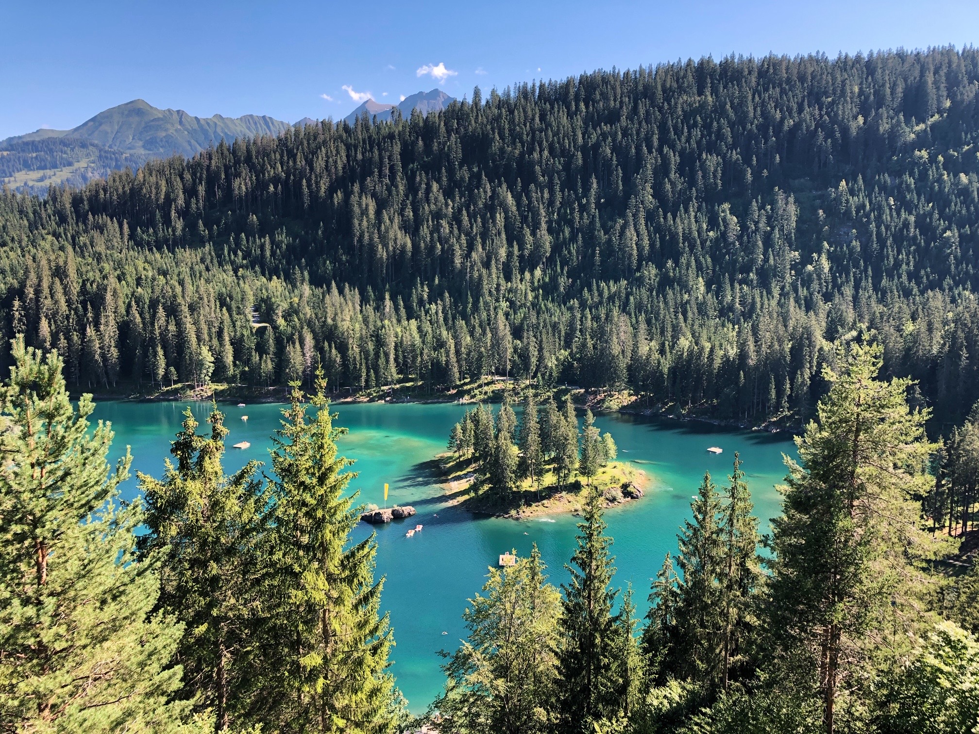 The amazing color from above, and the little island in the middle. This lake will surely be able to please even the most spoilt traveler! Caumasee in Flims definitely deserves a place on any Swiss lakes list! Tropical vibes guaranteed in a mountain setting! You can walk down and back up, or use the elevator. In summer, you pay an entrance fee to the lake. There is a restaurant, a snack, a playground, and stand-up paddle renting on-site. Our top tip on visiting this lake: come early, or late afternoon, as it can sometimes get a bit busy in summer.