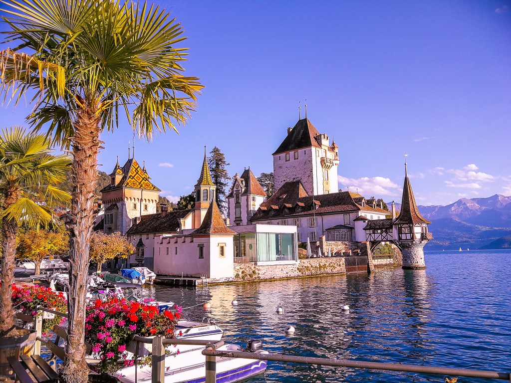 In summer, Lake Thun is absolutely magnificent. Its great atmosphere is completed with five lovely castles scattered around the lake: Hünneg Schloss, Spiez, Oberhofen, Schadau, and Thun.