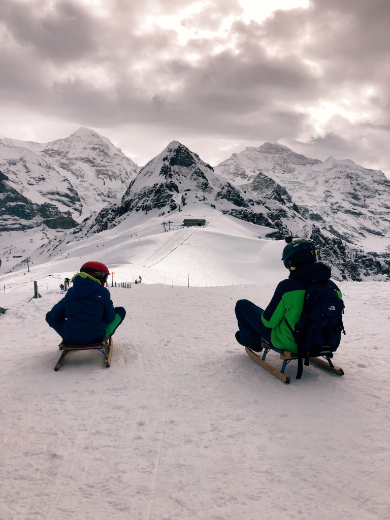 We went for a cool sledging adventure in Wengen on top of Männlichen and totally loved that run! We took the cable car to Männlichen from the Grindelwald Terminal and first admired the view up there. From Männlichen you can see as far as Lake Thun, and of course the view on the mountains is gorgeous. We went to Männlichen in Summer as well and it then has one of the most beautiful alpine playgrounds. In Winter, only the cow-shaped-slide is accessible, but still nice for the kids to play while you are ordering something at the restaurant on top.