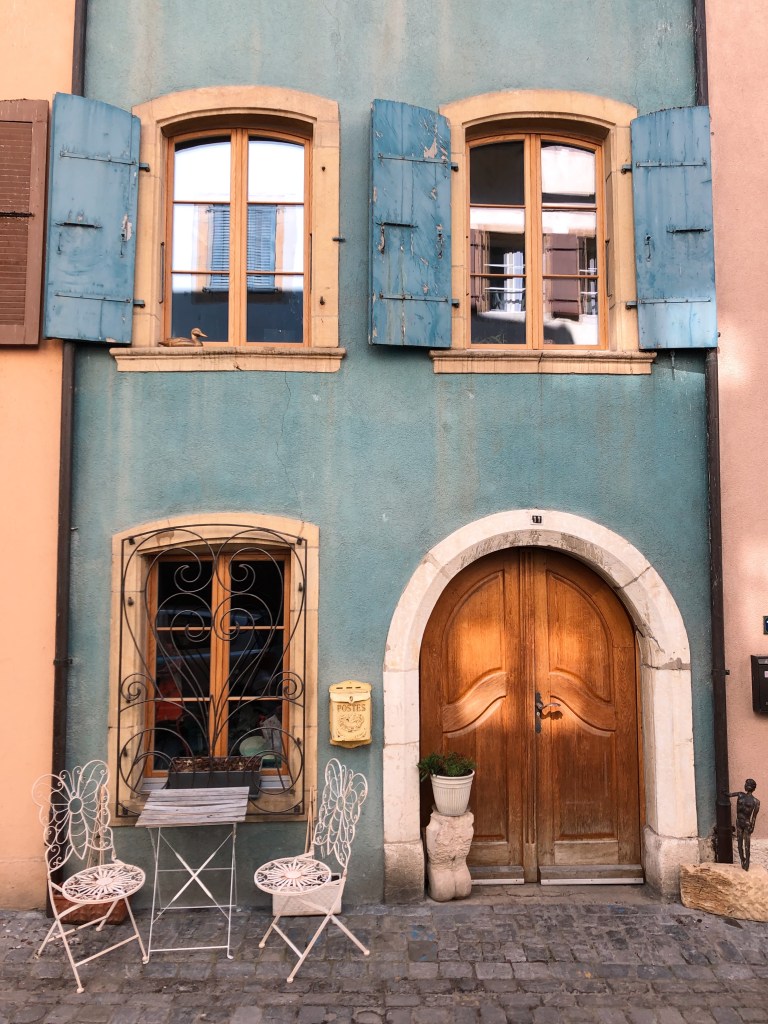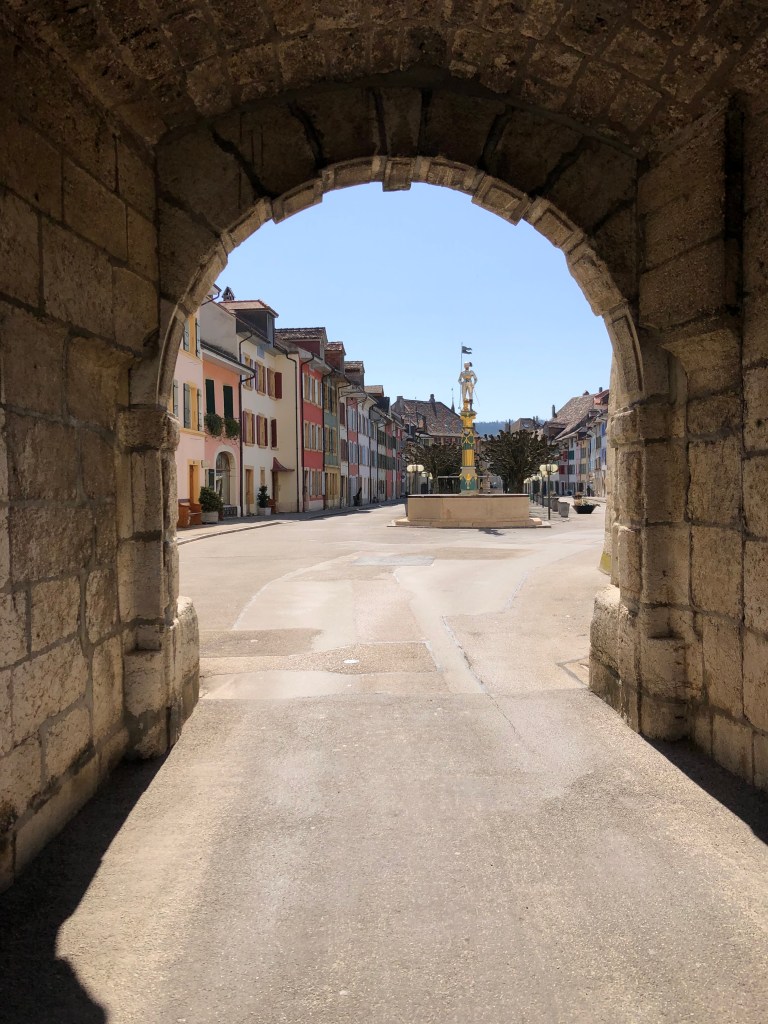 Le Landeron is in the Canton Neuchatel, and since we drove from Geneva, Le Landeron was our logical first stop. This village is beautiful, but very small. It basically is one street with beautiful colored houses, built around an area with planted trees. It has 2 typically Swiss decorated fountains, and benches in the middle. We chose to combine this small village with La Neuveville. If you haven’t been to the city of Neuchatel yet, you could also do a day trip focusing on just one Canton.