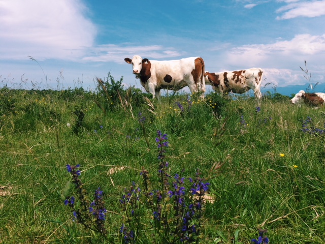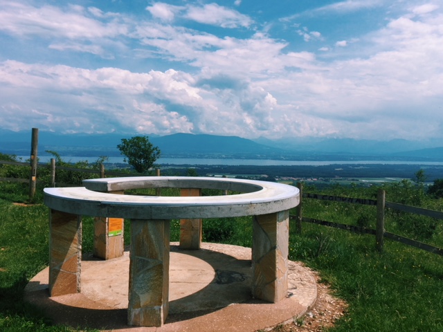 Mont Mourex is a beautiful place to enjoy views over Geneva and the lake and to have a picnic! Mont Mourex is located roughly between Gex and Divonne in the Ain region of neighboring France. To access there, we usually pass through Cessy to go to the small town of Mourex. A road will leave to the right to take you to a small parking lot. The last part of the road is a bit bumpy. From there you can walk over the meadows, see the cows and enjoy the views. We had our picnic on the highest part. Lovely place! You can also go to this viewpoint from the other side by going up through the woods. This is a good alternative on hot days. The starting point for that alternative, would be to park your car at the La Ferme du Mont-Mussy restaurant. You will find this on your left side when you leave Divonne-les-bains in the direction of Gex.