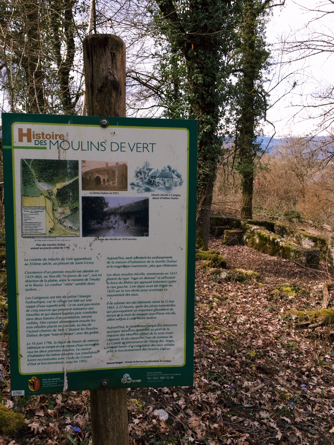 The name of the nature reserve refers to the water mills that were placed in Cartigny already in the 15th century. Along your hike you will find remains of one of the old mills. There is a sign explaining the history of the site.