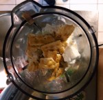 - Add 5 biscuits (plain salted biscuits), 200 ml of milk, and a bit of salt.