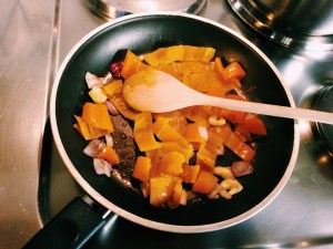 - Add your garlic, and your Aji Amarillo peppers, fry it all a bit more.
