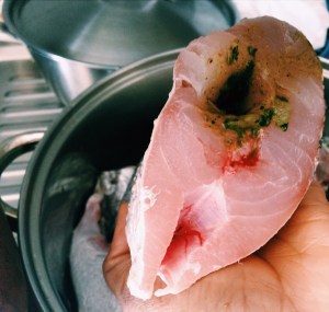 - Wash the fish and grate the skin a bit with a knife but while keeping the skin intact. The fish needs to stay in whole pieces in this dish.