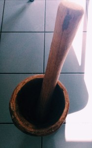 - Put the ¾ of the mixture in your mixer or African pestle and add 2-3 small onions cut in half, 1 vegetable stock cube and mix that all up.