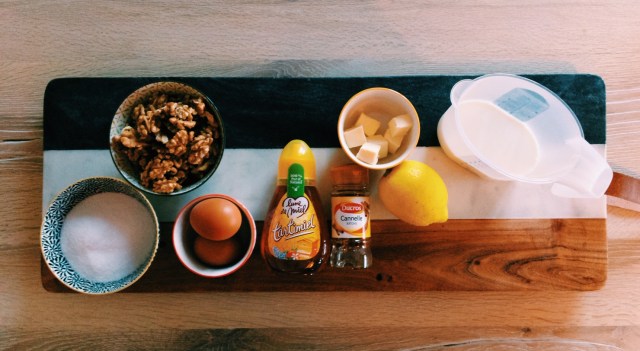 - Pour the boiling mixture over ground walnuts. Boil the honey and add it to the mixture. Add the lemon peel, cinnamon and rum. Stir. Then wait for the mixture to cool down.