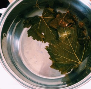 - When you wash the wine leaves you separate them a bit but not completely necessary. You then cook them for 2-3 minutes. This will take the salty taste off, and it will make them softer to make the rolling easier later on.